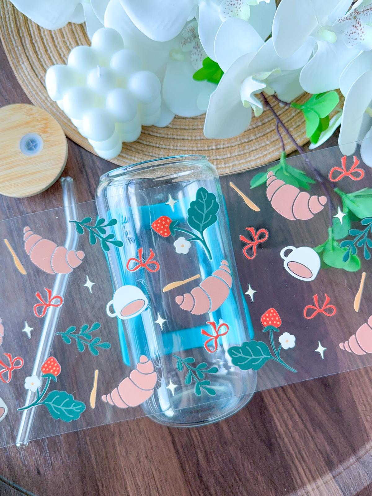 water only. Make sure the cup/tumbler is dry. - Carefully align and wrap the UV DTF around the glass. Trim any excess film as needed to ensure a proper fit and prevent overlapping when applying the wrap to the glass cup.