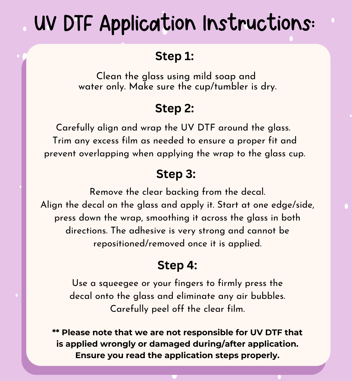 ** Please note that we are not responsible for UV DTF that is applied wrongly or damaged during/after application. Ensure you read the application steps properly.