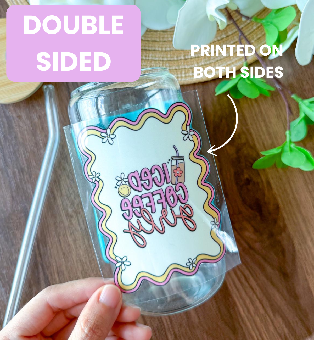 Personalize your tumblers, glasses or mugs with our adhesive peel-and-stick decals. There is no need for a heat press. Just peel and stick for a personalized touch. UV DTF technology makes for long-lasting designs.
