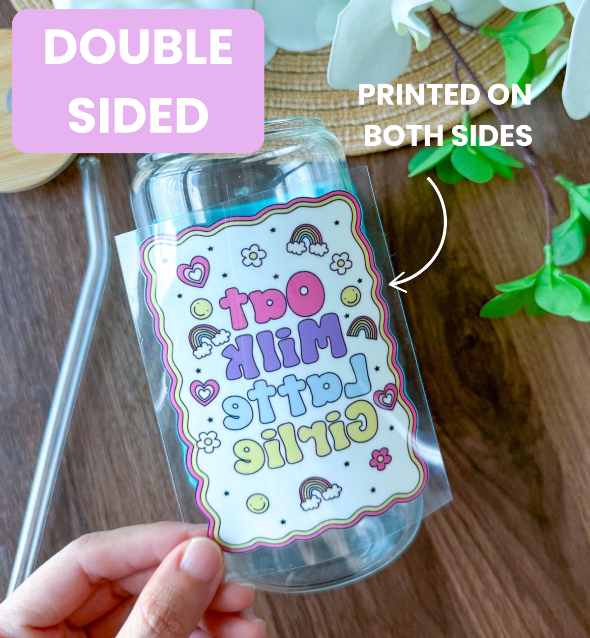 Personalize your tumblers, glasses or mugs with our adhesive peel-and-stick decals. There is no need for a heat press. Just peel and stick for a personalized touch. UV DTF technology makes for long-lasting designs.