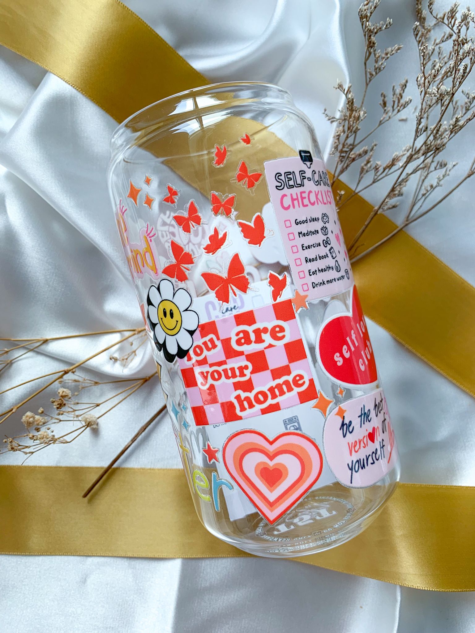 water only. Make sure the cup/tumbler is dry. - Carefully align and wrap the UV DTF around the glass. Trim any excess film as needed to ensure a proper fit and prevent overlapping when applying the wrap to the glass cup.